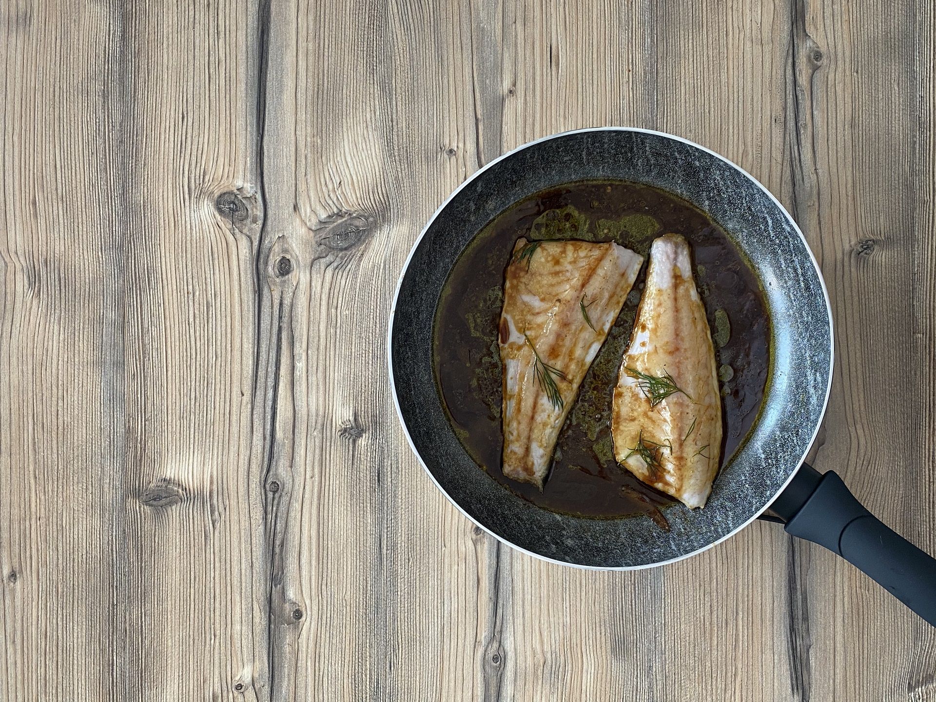 Remove the vegetables from the pan, add the sea bass fillets, add the dill and drizzle with the soy sauce dressing. Season with salt and cook, then add the previously cooked vegetables and finish cooking for a few more minutes. Serve on a plate.