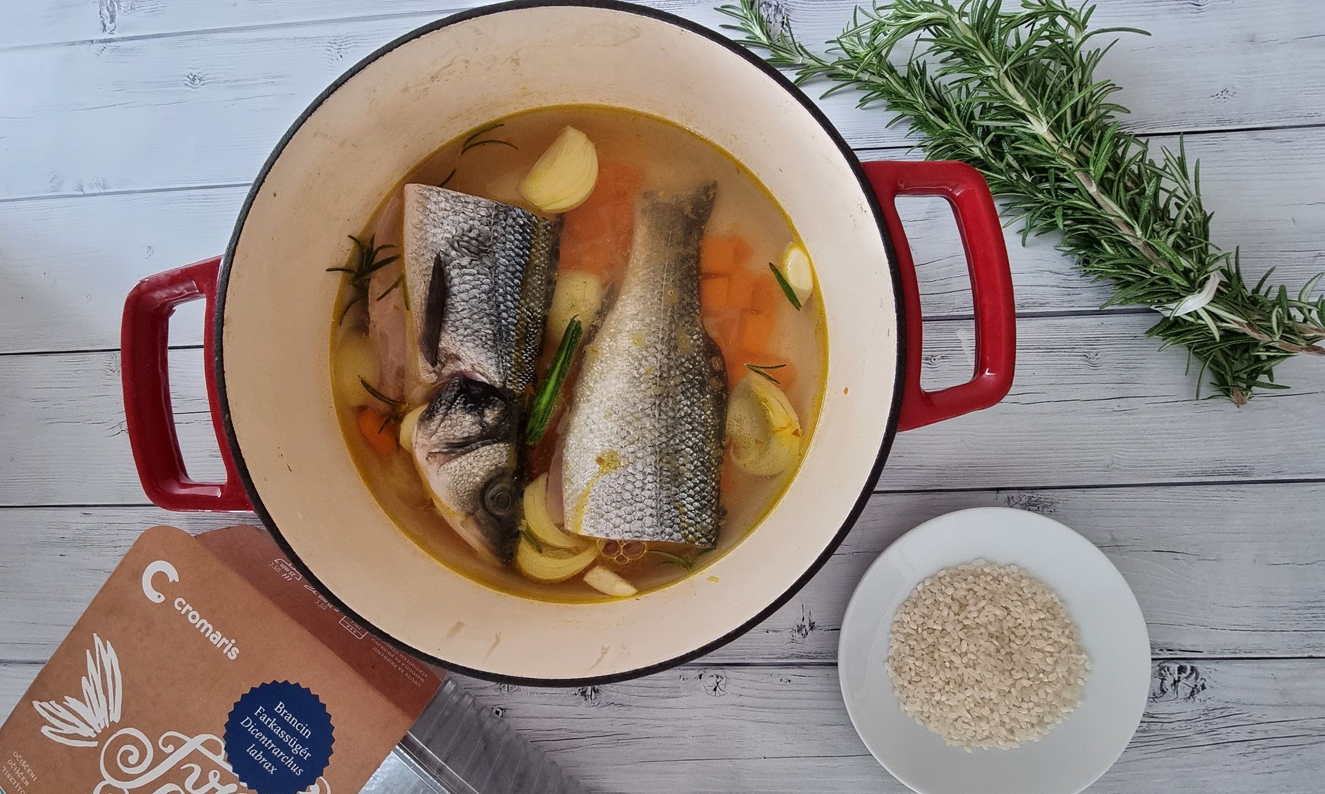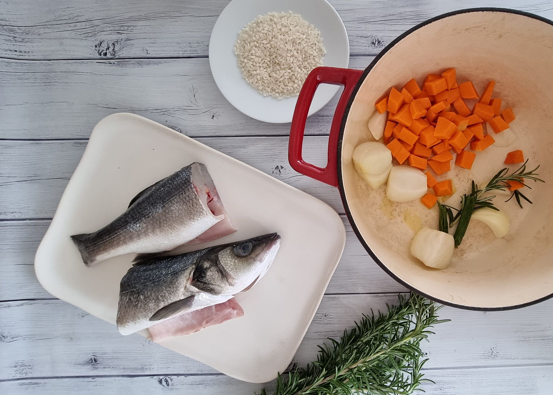 Sautée on medium heat until the vegetables release their aroma and start sticking to the bottom of the pot. Add the garlic and sautée for one more minute. Add some cold water. Add the fish and cook for 15–20 minutes. Take the fish out and transfer the vegetables into the food processor (set aside several pumpkin cubes for serving). Separate the leaves from the rosemary and mix them in with the vegetables, dispose of the stem. Process the vegetables into a purée, then put the purée back into the previously strained soup. Add some more salt, pepper and the rice, then cook. In the meantime, remove the head, bones and skin from the fish and discard. Slice the fish and add it to the soup once the rice is done. Bon appétit