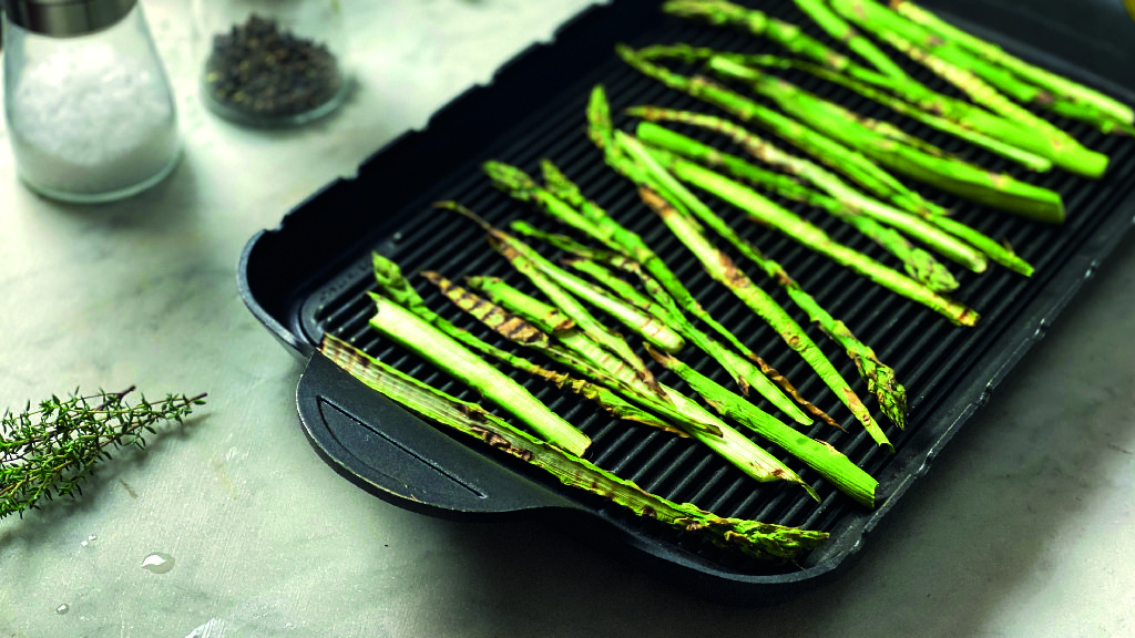 Clean the asparagus and remove the tough end. Cut them lengthwise and grill them for a few minutes, until crispy.