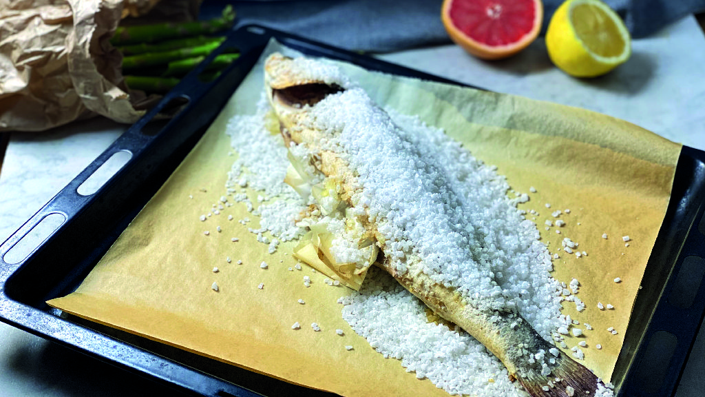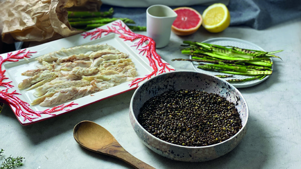 Prepare the vinaigrette by mixing the tahini sauce with the soy sauce, the grapefruit juice, a few drops of lemon juice, oil, salt and pepper. Take the fish out of the oven, remove the salt crust that has formed, clean it and place it on top of the lentils, add the asparagus and top with the vinaigrette. Enjoy!