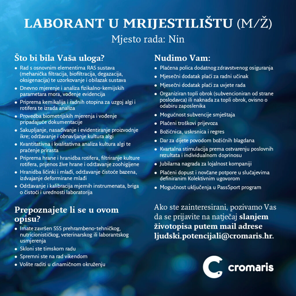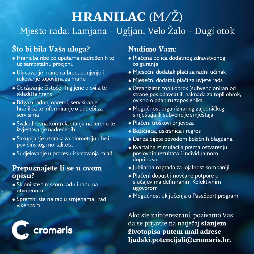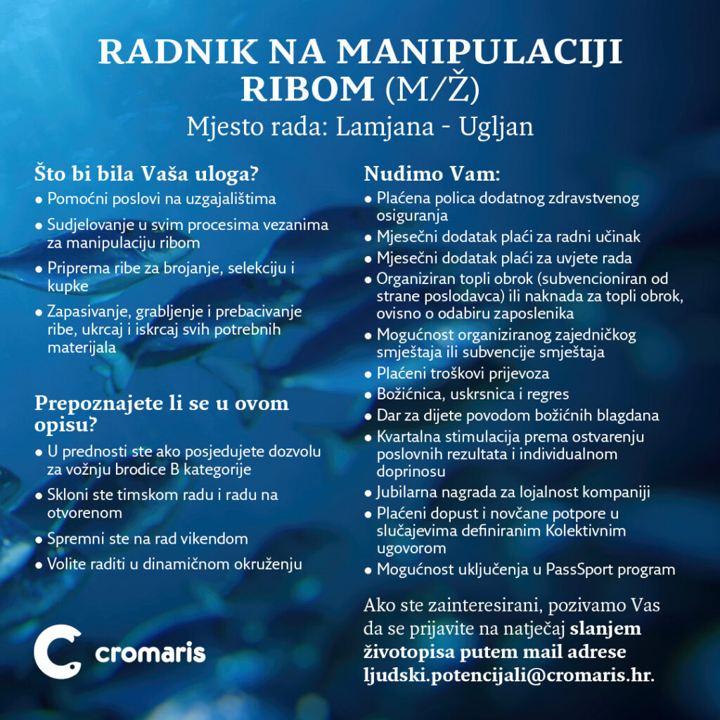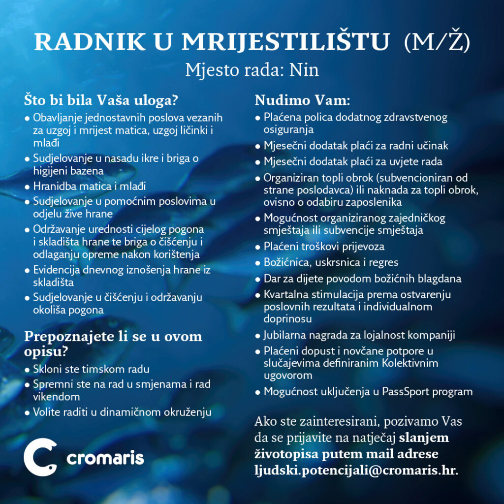 Kolega Alen Bajnoci je svoju karijeru u Cromarisu započeo kroz pripravnički program Budućnost u Adrisu, danas je glavni tehnolog na uzgajalištu. Pogledajte njegovu priču:
