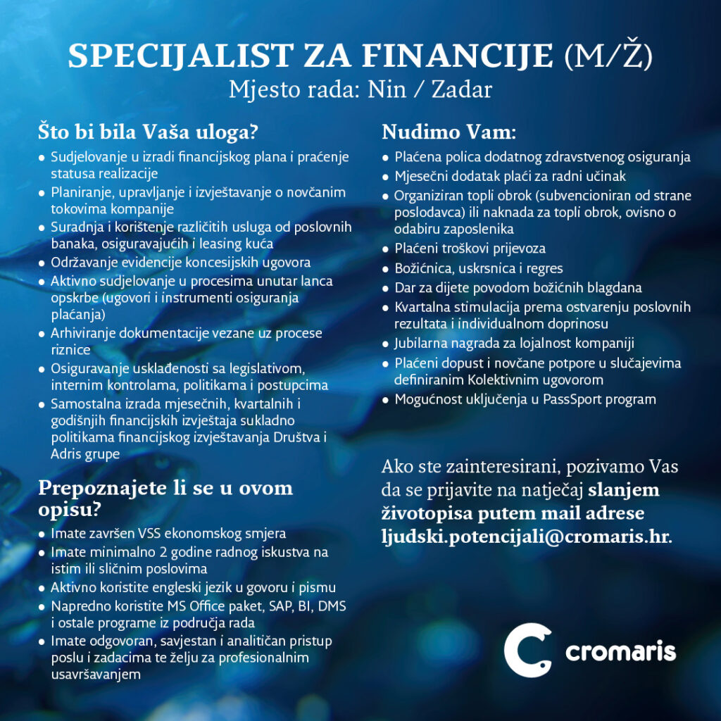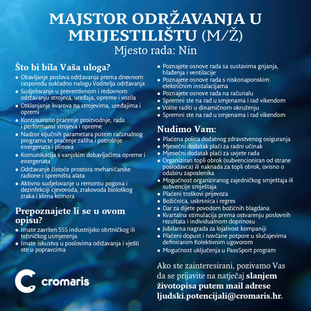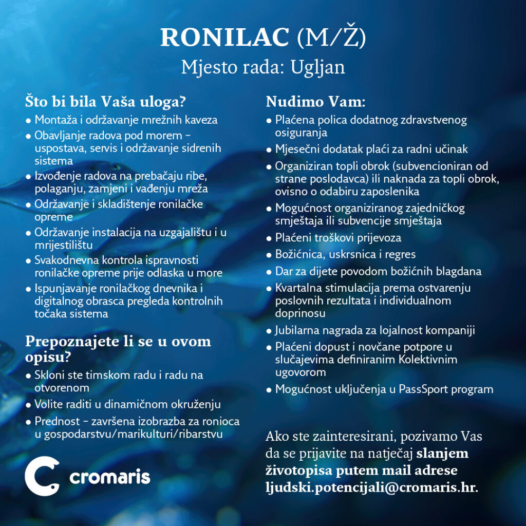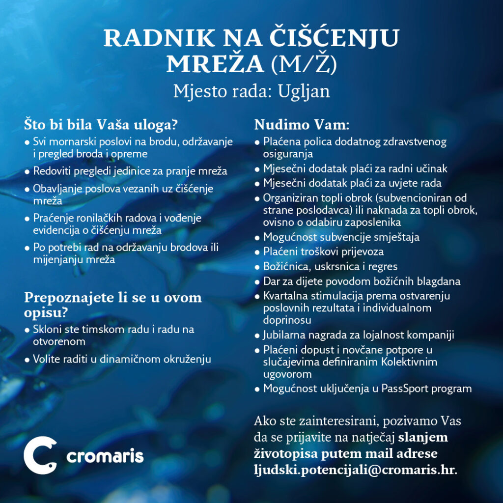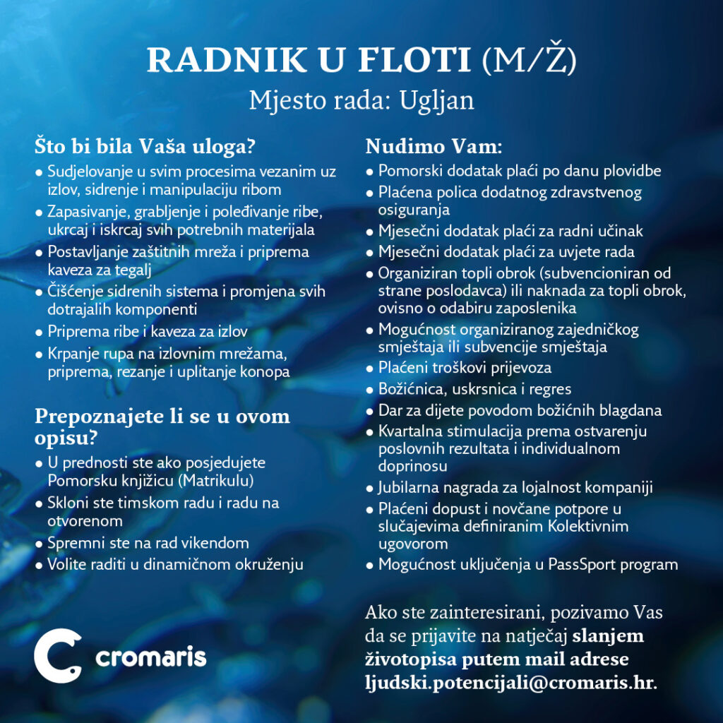 Svakim novim danom cilj nam je biti moderniji, bolji i inovativniji, a za uspjeh i inovaciju potrebno je biti uporan i dosljedan, te imati veliko povjerenje u sebe i u tim. Cromaris ponuda je svakim danom sve šira i bogatija, pa tako i svaku različitost unutar našeg tima vidimo kao našu prednost i priliku za napredak i daljnje inovacije, jer samo kao tim, dijeljenjem znanja i iskustava postajemo i ostajemo veliki. Zaplivajte u moru novih prilika i prijavite se na natječaje za pozicije: