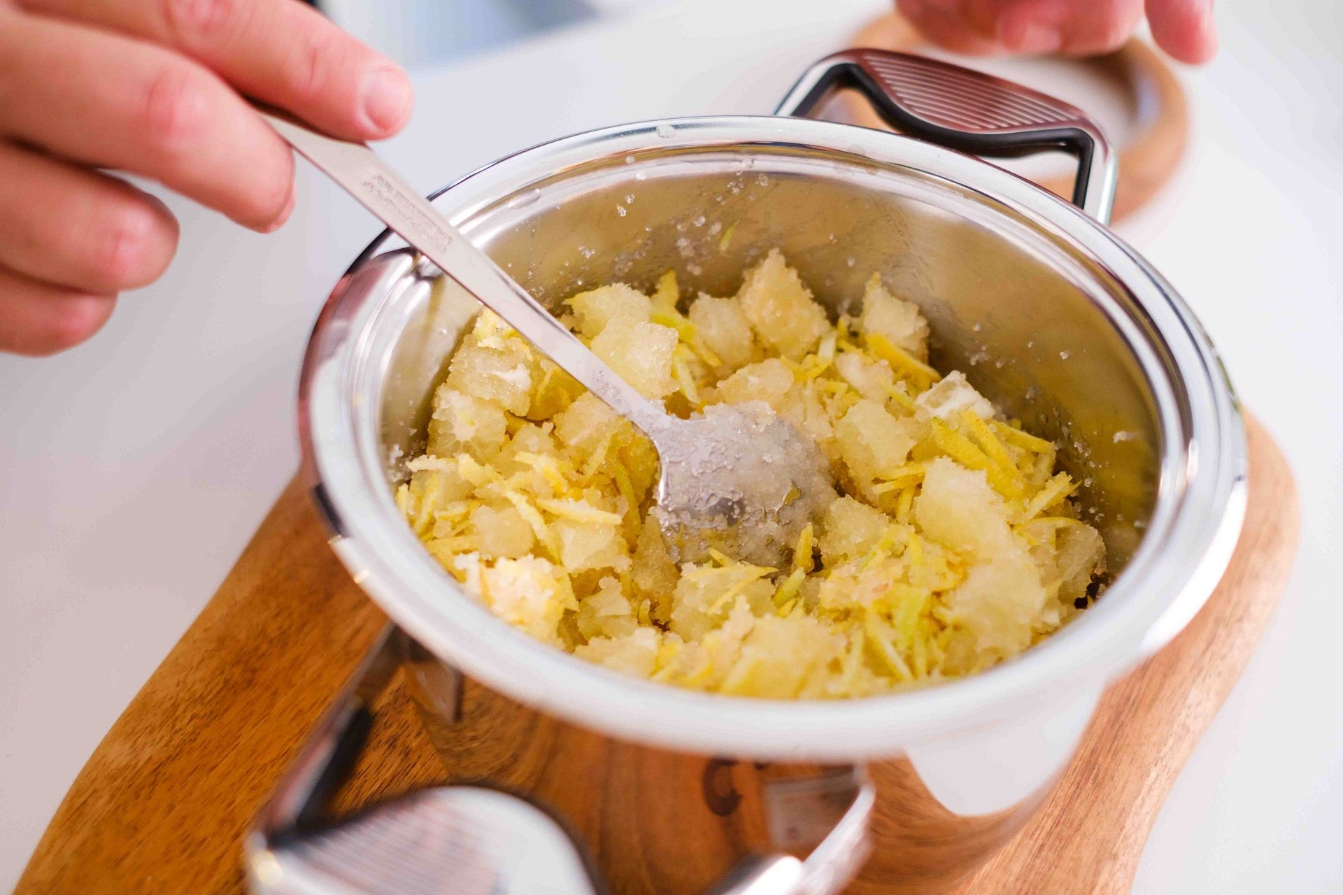Za kompot od limuna operite i nasjeckajte čili papričicu. Odrežite vrške limuna i izrežite ga uzdužno na 3 dijela, pomiješajte sa šećerom i čili papričicama pa pustite da odstoji 12 sati. Pirjajte u tavi dok se ne karamelizira. Stavite u blender i, da biste dobili homogenu teksturu, dodajte sirup od šećerne trske i prilagodite začine s pomoću limunovog soka.