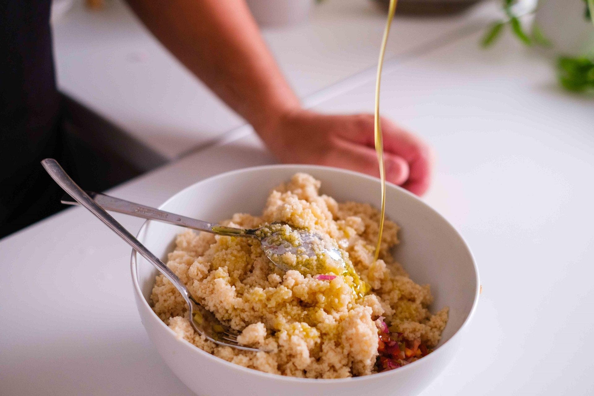 Kuhajte vodu dok ne zakuha i dodajte kus kus, kuhajte na laganoj vatri dvije minute, zatim prelijte u posudu i prekrijte prozirnom prianjajućom folijom. Nasjeckajte povrće na kockice i marinirajte ga 5 minuta u octu. Vilicom razdvojite kus kus u zrnca te dodajte povrće i metvicu. Začinite.