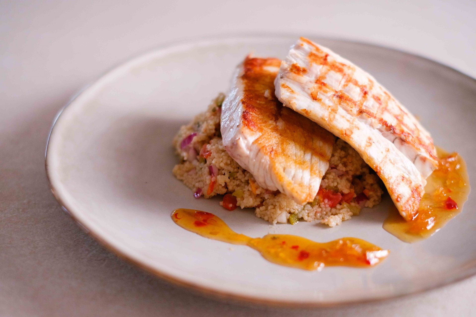 Nanesite malo ulja na kožu ribe, stavite filete na vruću rešetku roštilja i pecite otprilike 8 minuta na strani gdje se nalazi koža. Razmažite jednu jušnu žlicu kompota na tanjur i dodajte kus kus. Položite filete na kus kus i poškropite s ostatkom maslinovog ulja te poslužite s komadom limuna.