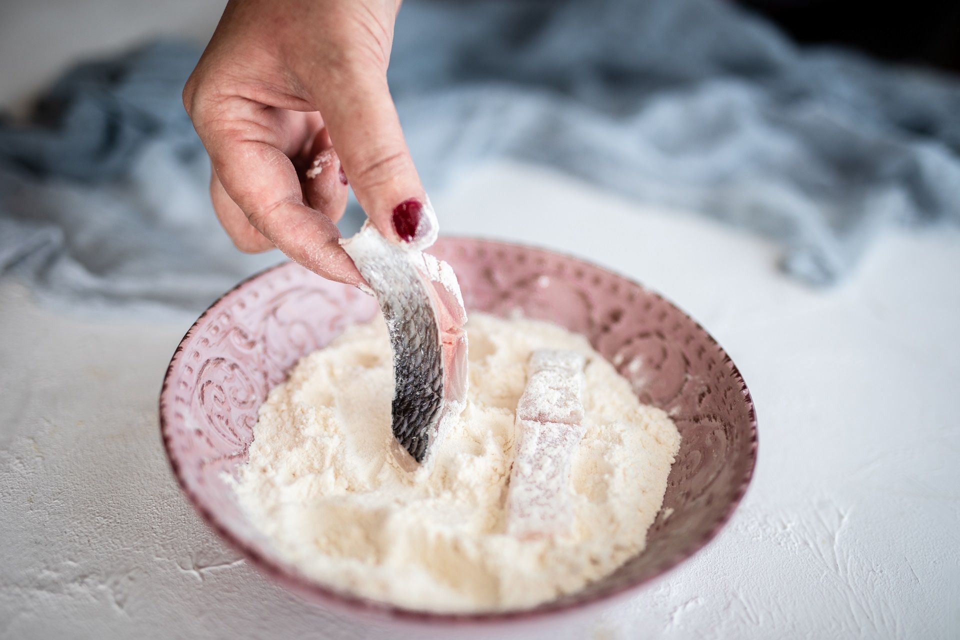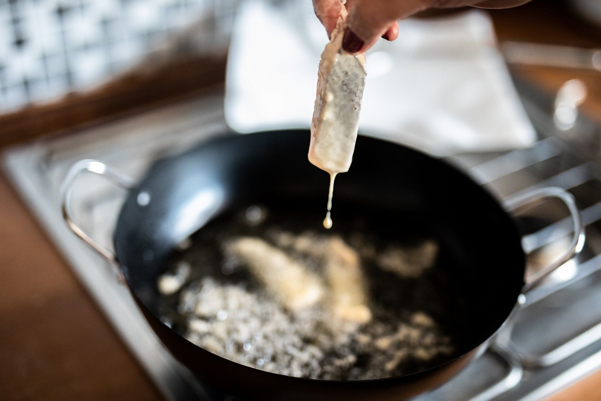 Komade ribe uvaljajte prvo u brašno, zatim umočite u tempuru pa pažljivo stavite u vruće ulje.