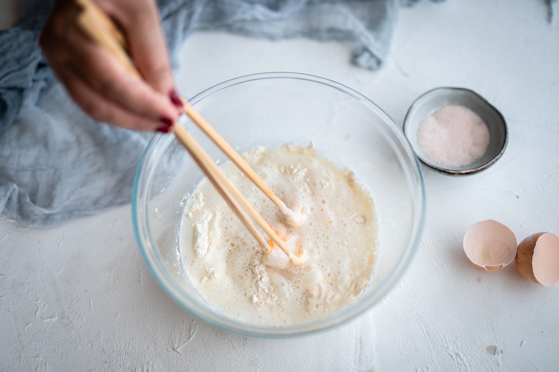 Pripremite tempuru – u zdjelu stavite žumanjak, dodajte jako hladnu mineralnu vodu, brašno, gustin i kockice leda. Posolite i sve brzi i kratko promiješajte. Smjesa za tempuru treba biti nešto rjeđa od smjese za palačinke, nije bitno ako vam ostane nešto grudica u tijestu.